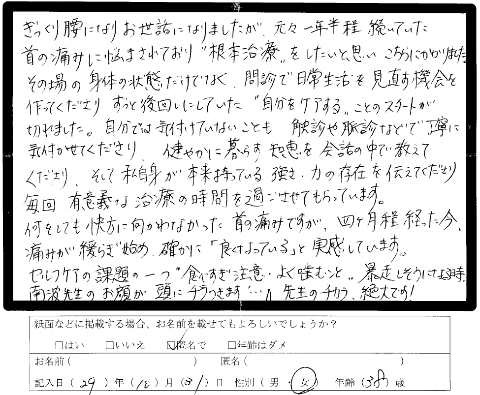 これからも施術を受け続けて、体調を整えたいと思います。